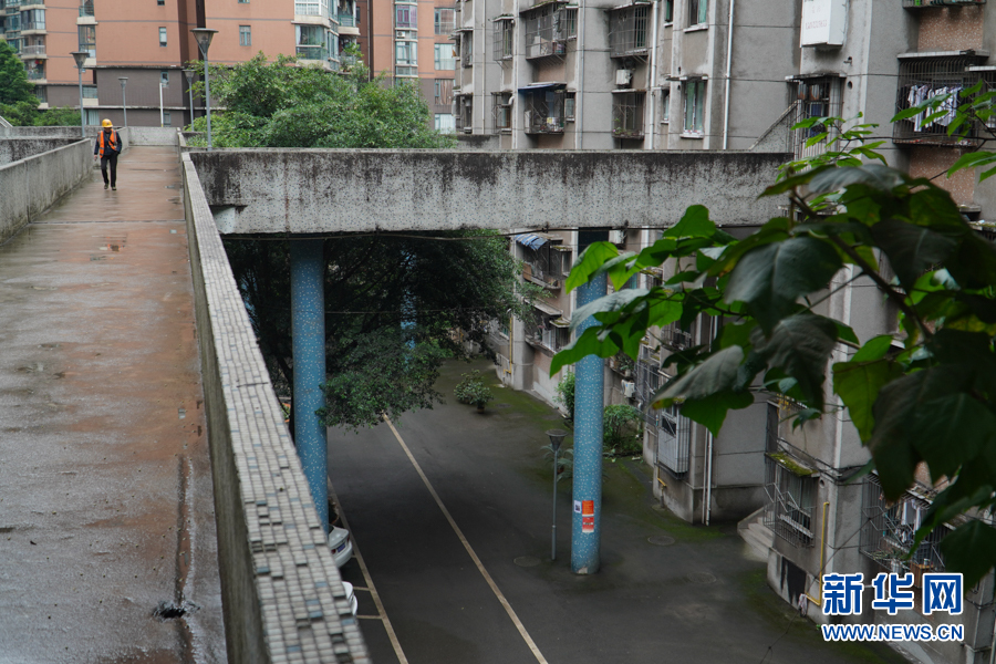 據(jù)了解,該小區(qū)位于重慶市渝中區(qū)長江二路。通過這個(gè)空中走廊,居民可以直接走到和天橋齊平的街道上去。新華網(wǎng) 耿駿宇 攝