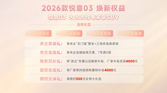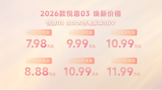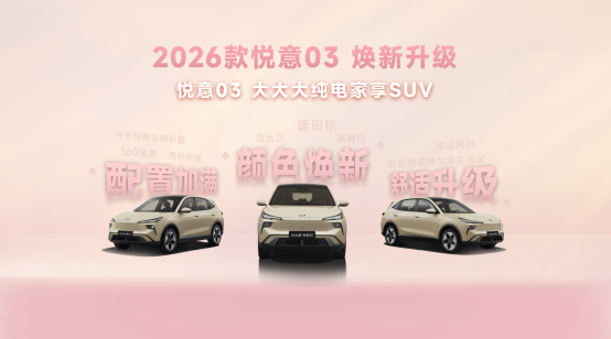 三月春暖,悦见花开。3月8日,实力演员张若昀直播助阵,“大大大纯电家享SUV”焕新而来,2026款悦意03挚爱上市。445km、565km两种续航共计6款车型,官方售价7.98-11.99万元。围绕年轻小家庭,尤其是家庭女性用户的进阶需求,从颜色推新到舒适满配,2026款悦意03带来全新晨晖金车色、晨曦白内饰色等20余项升级,让用车更舒心、开车更省心、养车更安心,正如张若昀所说:“悦意03是真舒适的纯电SUV。”当前购车还可享7年0息贷款、无门槛整车及三电终身质保等丰富权益,轻松开启高品质纯电生活。