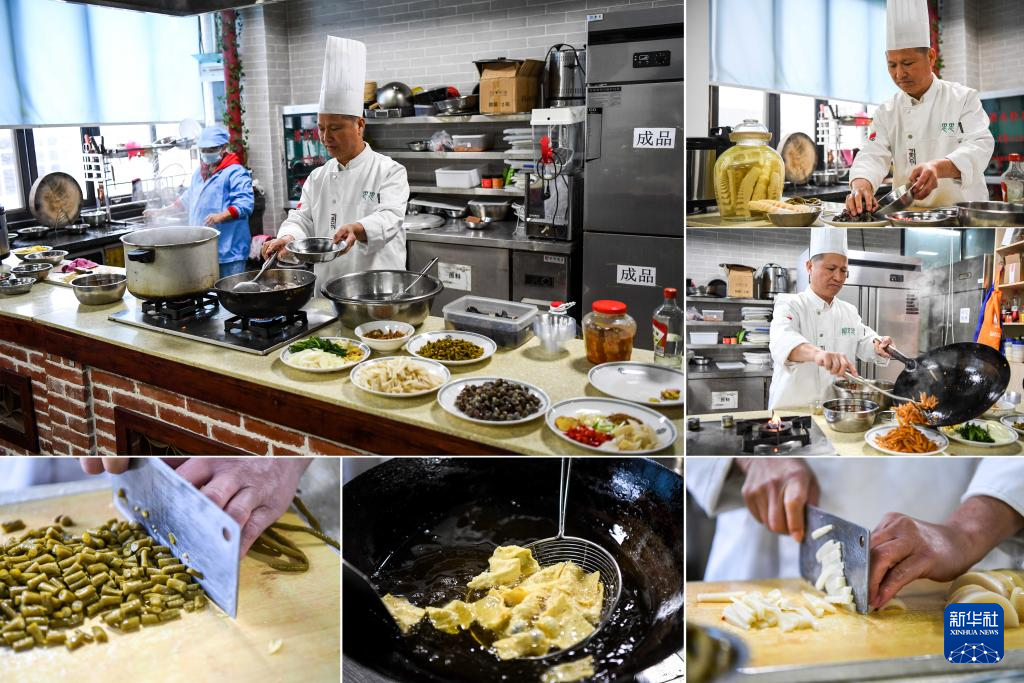 12月12日,柳州螺蛳粉制作技艺非遗传承人黎元龙展示螺蛳粉的制作流程(拼版照片)。