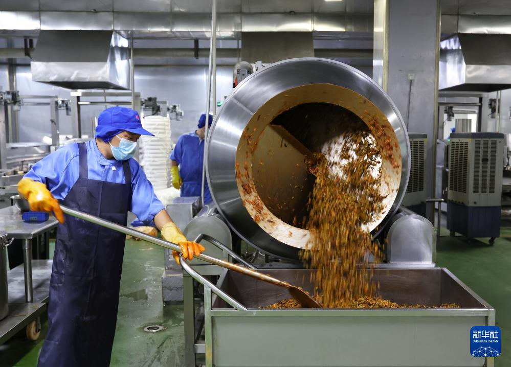 柳州市螺蛳粉产业园的一家螺蛳粉生产企业工作人员在腌制酸豆角(11月13日摄)。