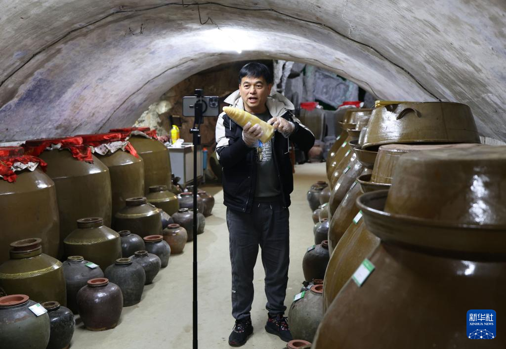 12月13日,柳州螺蛳粉制作技艺非遗传承人陈伟在一家老酸水菌种库通过社交媒体介绍酸笋。
