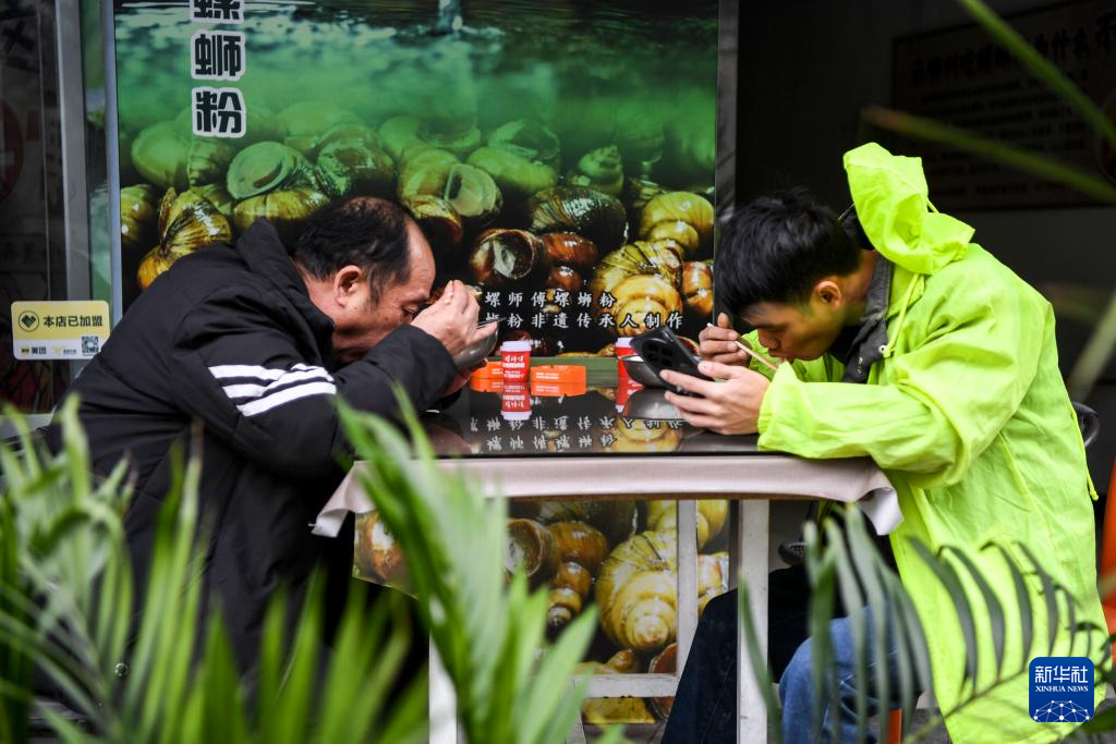 12月13日,两名市民在柳州市街头吃螺蛳粉。
