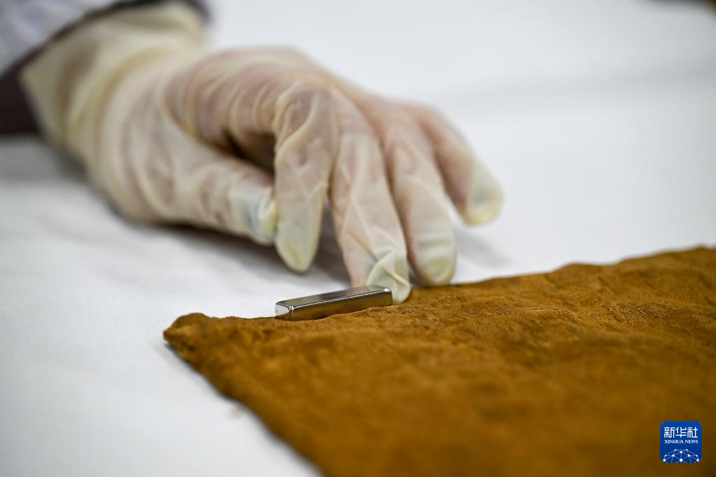 陈琰璐将丝绸文物放置在铁质工作台,使用磁铁为衣物进行平整矫形(5月18日摄)。