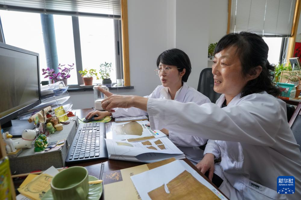 陈琰璐(后)和孟小紬在讨论文物修复方案(5月18日摄)。