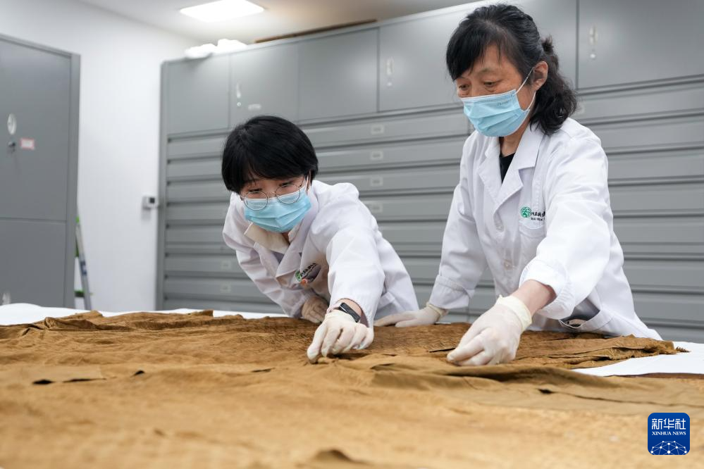 陈琰璐(左)和孟小紬在整理明代四合如意云纹缎褡护(5月18日摄)。这件衣服衣长122厘米,通袖长116厘米,2002年在苏州市相城区出土,出土时织物破损严重。团队对文物进行全面“体检”,从除虫灭菌、清理、平整,到配置修复面料、染色,再到针线缝合加固,目前这件文物的修复工作已经持续三个多月。