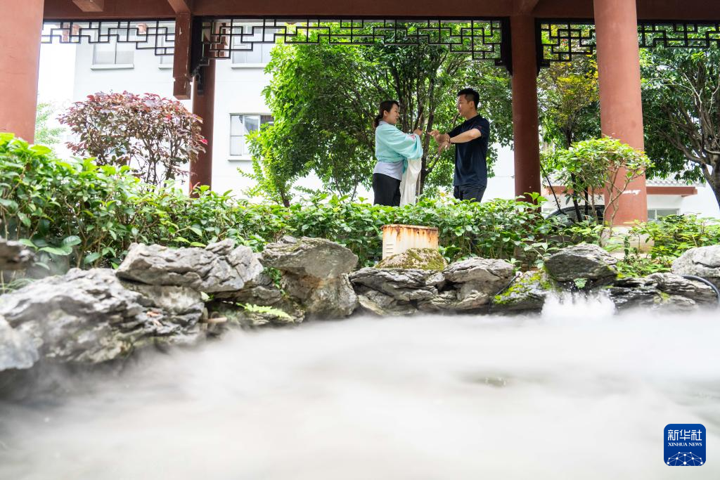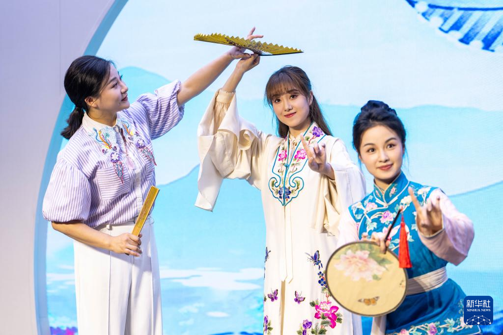 6月4日,在郴州市北湖区人民路街道万花冲社区,湖南省昆剧团青年演员(左一、右一)在带领观众体验昆曲。