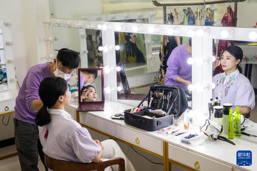 6月3日,在湖南省昆剧团化妆间,一级演员刘捷(右)在演出前化妆。