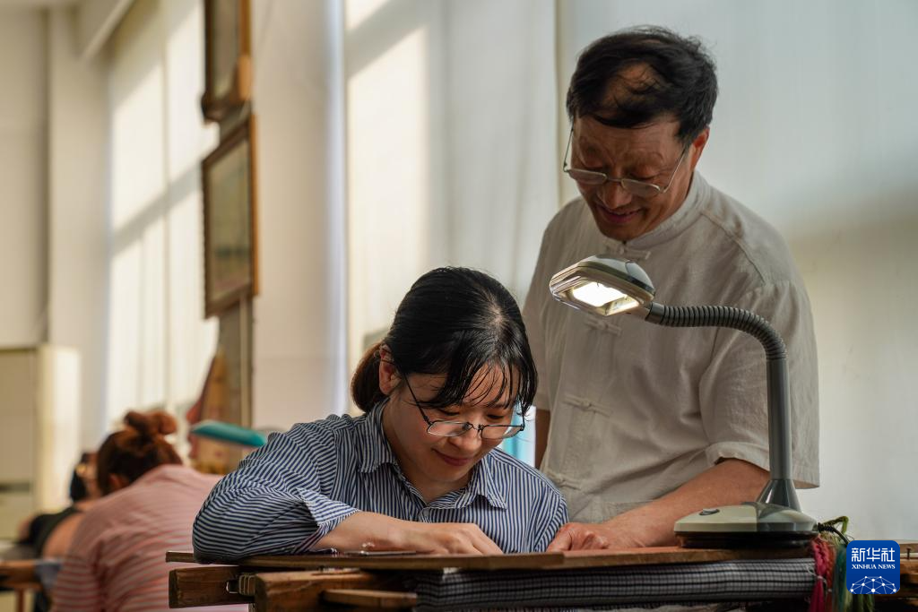 6月6日,在东台嘉丽发绣厂,东台发绣传承人陈伯余指导徒弟绣制发绣作品。