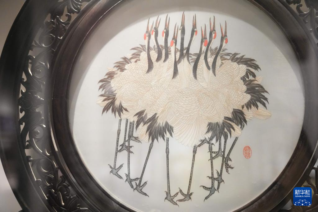 6月6日在东台市博物馆拍摄的以丹顶鹤为题材的发绣作品。