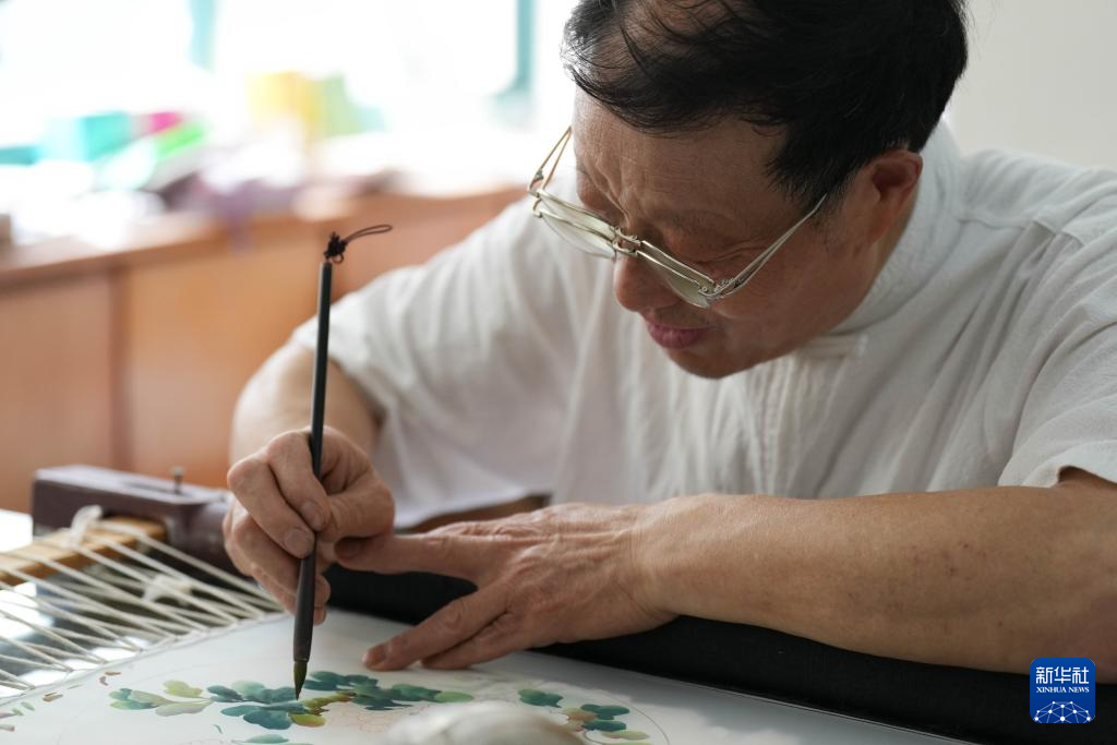 6月6日,在东台嘉丽发绣厂,东台发绣传承人陈伯余用颜料勾画样稿。这一环节是发绣的前置,称为“勾绷落样”。