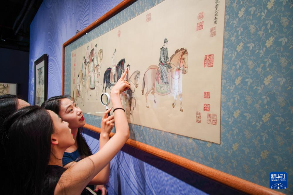 6月6日,在东台西溪天仙缘景区内的东台发绣展示馆,游客观赏、讨论发绣作品《虢国夫人游春图》。