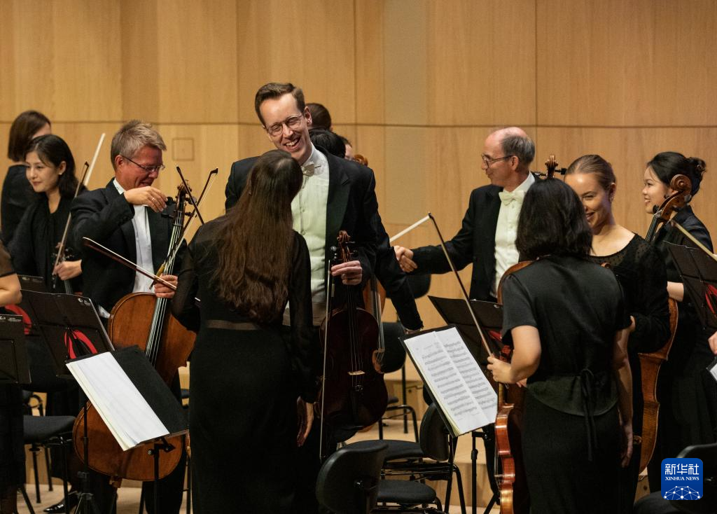 8月13日,在德国法兰克福克伦贝格音乐学院卡萨尔斯音乐厅,中德音乐家演出后相互致意。