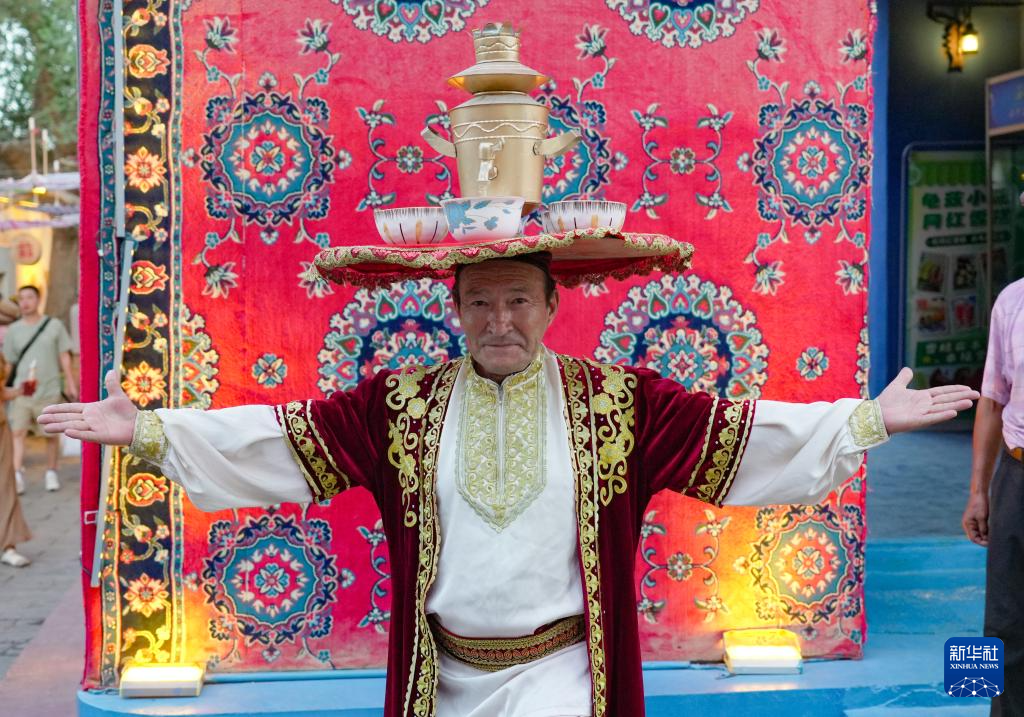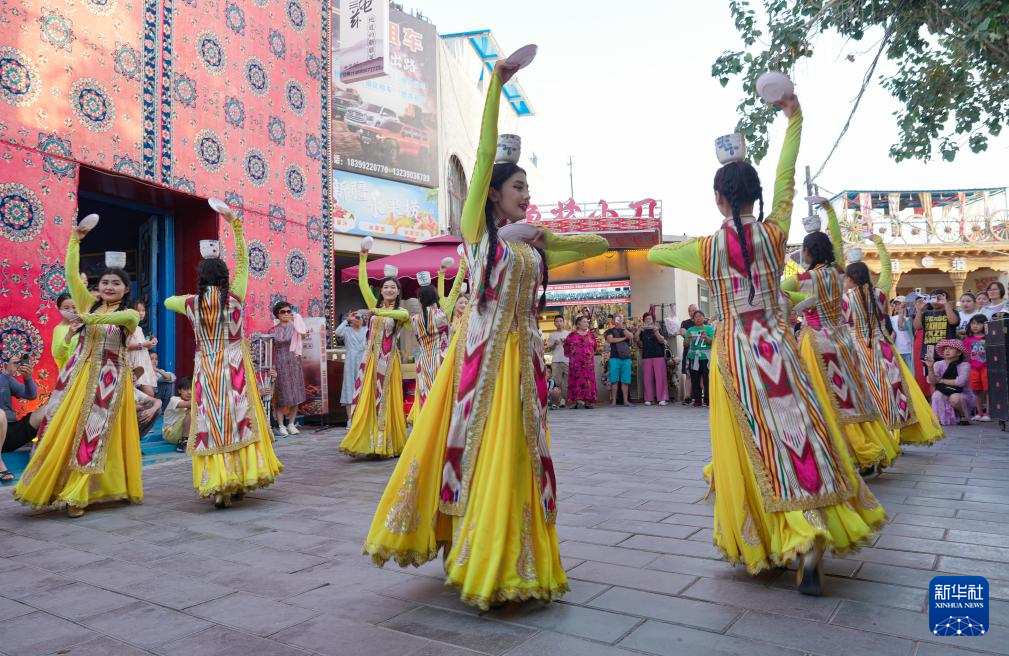 9月9日,在位于新疆乌鲁木齐的大巴扎步行街疆来城,演员在表演萨玛瓦尔舞。