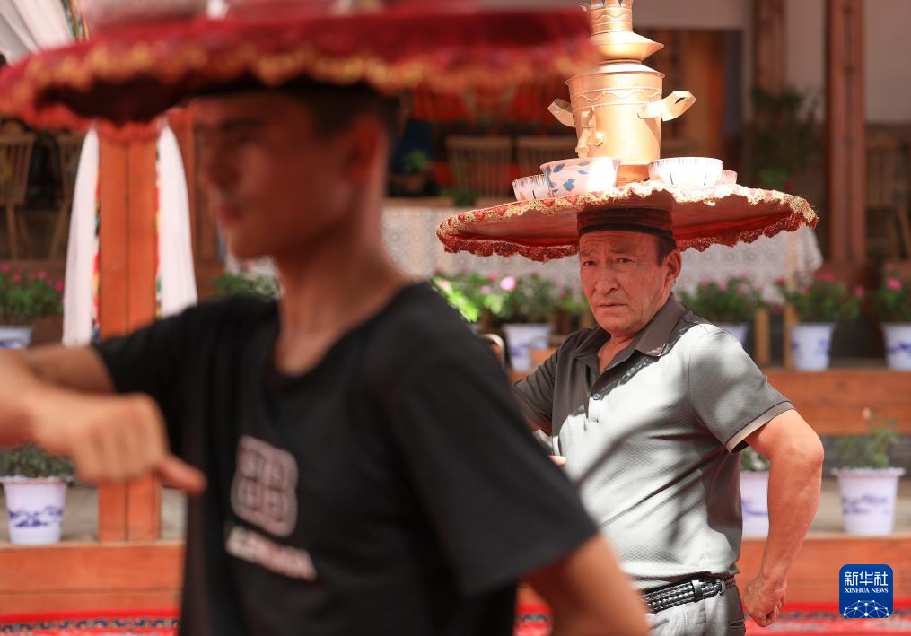 7月22日,在新疆库车市的龟兹小巷,民间艺人帕尔哈提(右)给年轻舞者教授萨玛瓦尔舞动作要领。