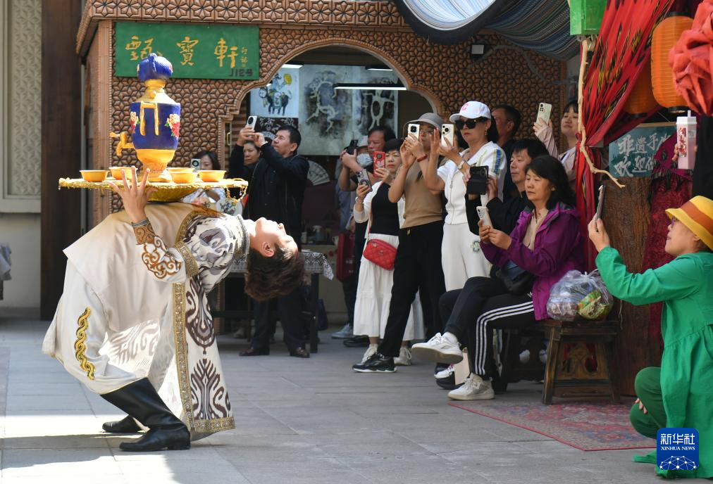 7月22日,在新疆库车市的龟兹小巷,演员表演顶碗舞。