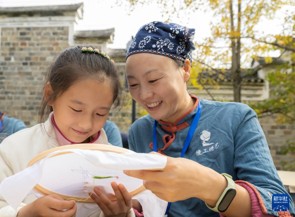 11月2日,一名绣娘在湖北省宜昌市秭归县屈原故里景区芈绣馆指导小朋友刺绣。