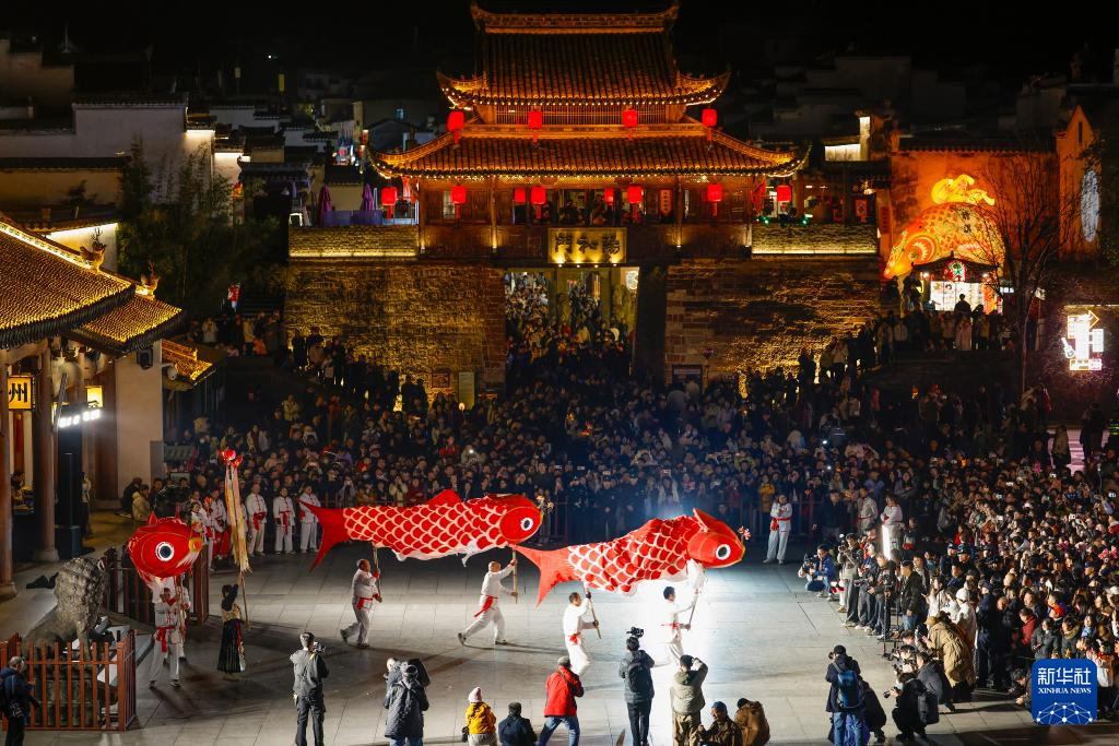 2月4日,在安徽省黄山市歙县徽州古城,人们在观看汪满田村的鱼灯表演队表演。