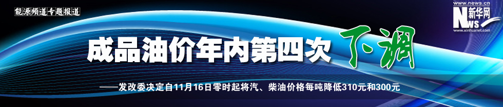 發(fā)改委決定自11月16日零時起將汽、柴油價格每噸降低310元和300元,折算到90號汽油和0號柴油(全國平均)每升零售價分降0.23元和0.26元。 [詳細]