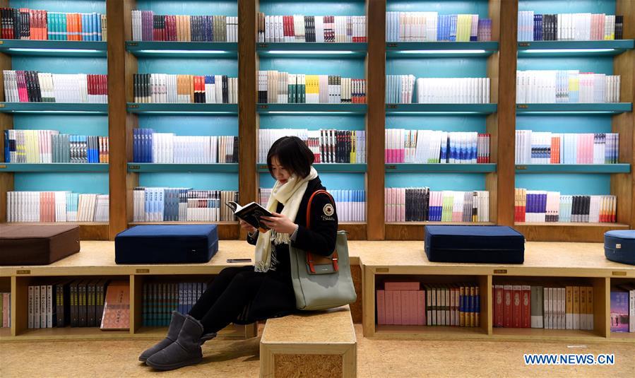 A woman reads at the 24-hour Chengming Bookstore in Shijiazhuang, capital of north China's Hebei Province, Dec. 18, 2017. (Xinhua/Zhang Shuo)