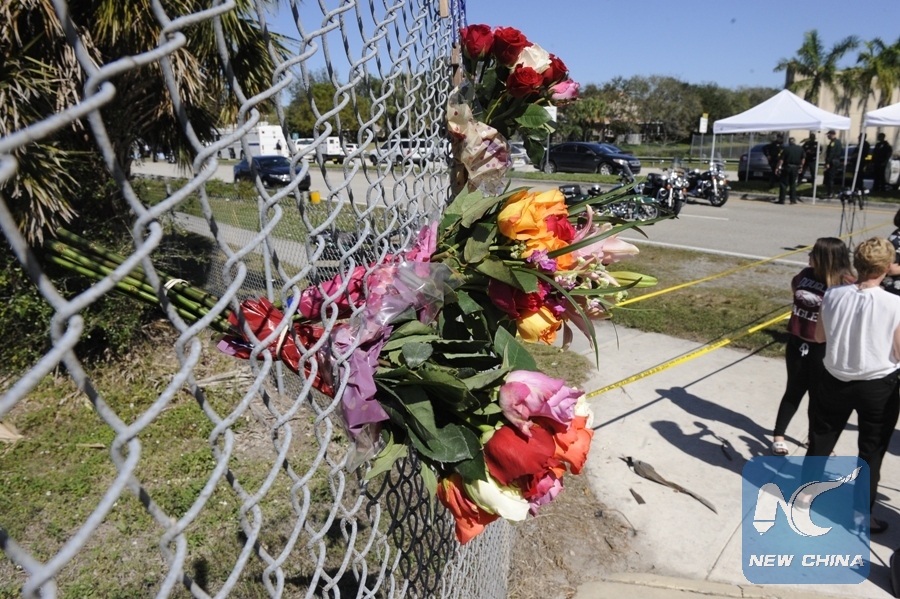Flowers are placed on a fence near Marjory Stoneman Douglas High School to mourn for the victims, in Parkland, Florida, the United States, Feb. 15, 2018. Seventeen people were killed in a mass shooting in a high school inFlorida in the United States Wednesday, local police said. (Xinhua/Liu Yang)