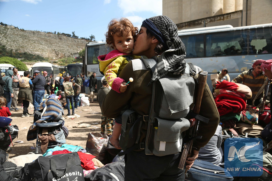 A rebel fighter from Eastern Ghouta, holds his weapon as he kisses a child after arriving in Qalaat al-Madiq, some 45 kilometres northwest of the central city of Hama, on March 30, 2018. (AFP photo)