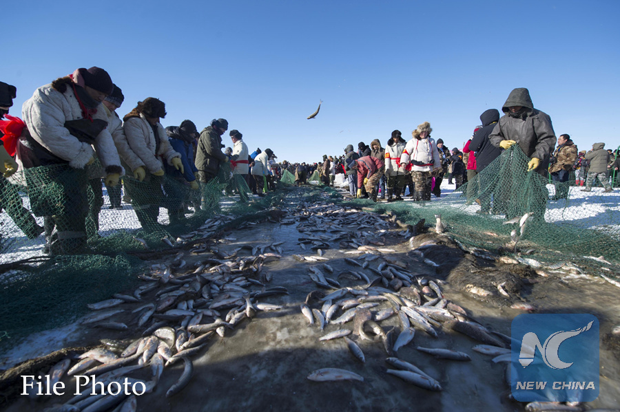 Fishermen catch fishes on the Dalinor Lake in Hexigten Banner of Chifeng City, north China's Inner Mongolia Autonomous Region, Dec. 29, 2016. The Dalinor Lake is a major fishery production base of Inner Mongolia. (Xinhua/Sun Guoshu)