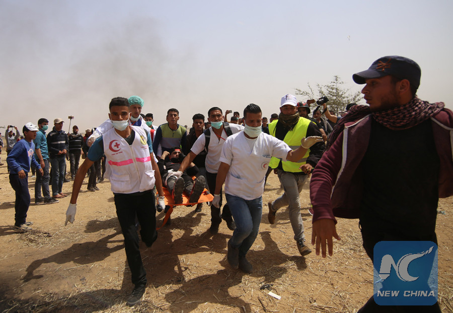 GAZA, April 13 (Xinhua) -- As soon as they heard the whizz of Israeli gunshots, paramedics and medics ran quickly to rescue the lives of Palestinian protestors, who got injured by Israeli troops' gunfire during the clashes near the border between eastern Gaza Strip and Israel.