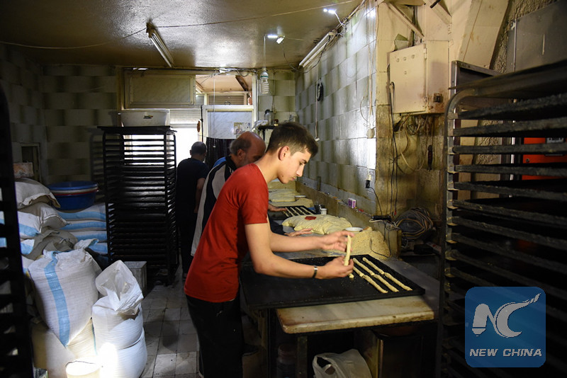 A baker prepares sesame seed breadsticks in an ancient bakery in the old city of Aleppo, northern Syria, on May 6, 2018. (Xinhua/Hummam Sheikh Ali)