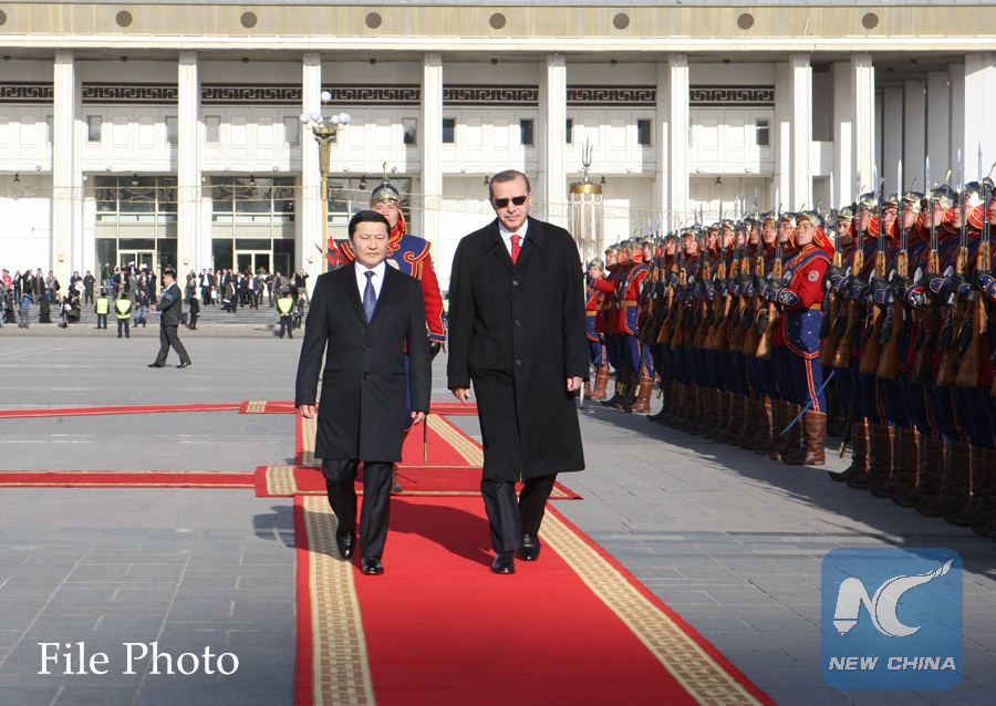 File photo taken on April 11, 2013 shows the then Mongolian Prime Minister Norov Altanhuyag (L) and the then Turkish Prime Minister Recep Tayyip Erdogan inspecting the guards of honor during a welcome ceremony in Ulan Bator, capital of Mongolia. (Xinhua/Shi Yongchun)