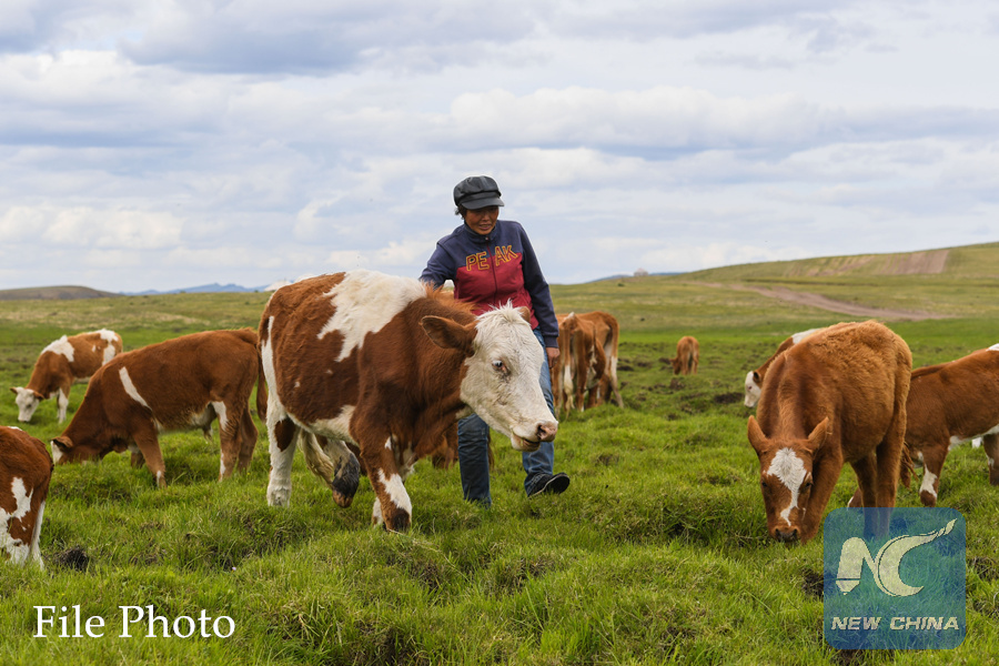 Aodunhu, Erden's wife, herds cattle at the summer pasture at the Ar Horqin Banner in Chifeng City, north China's Inner Mongolia Autonomous Region, June 5, 2018. (Xinhua/Peng Yuan)
