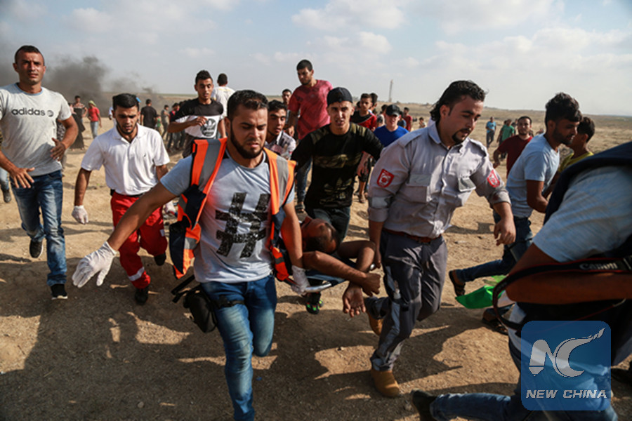 GAZA, Aug. 3 (Xinhua) -- A Palestinian was killed and 220 others injured during clashes with Israeli soldiers in the eastern Gaza Strip close to the border with Israel on Friday afternoon.