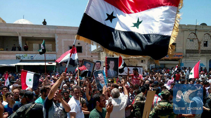 Syrians celebrate as they hold their national flags and pictures of Syrian president Bashar al-Assad in the town of al-Hrak, Daraa province, Syria on July 17, 2018. (SANA photo)