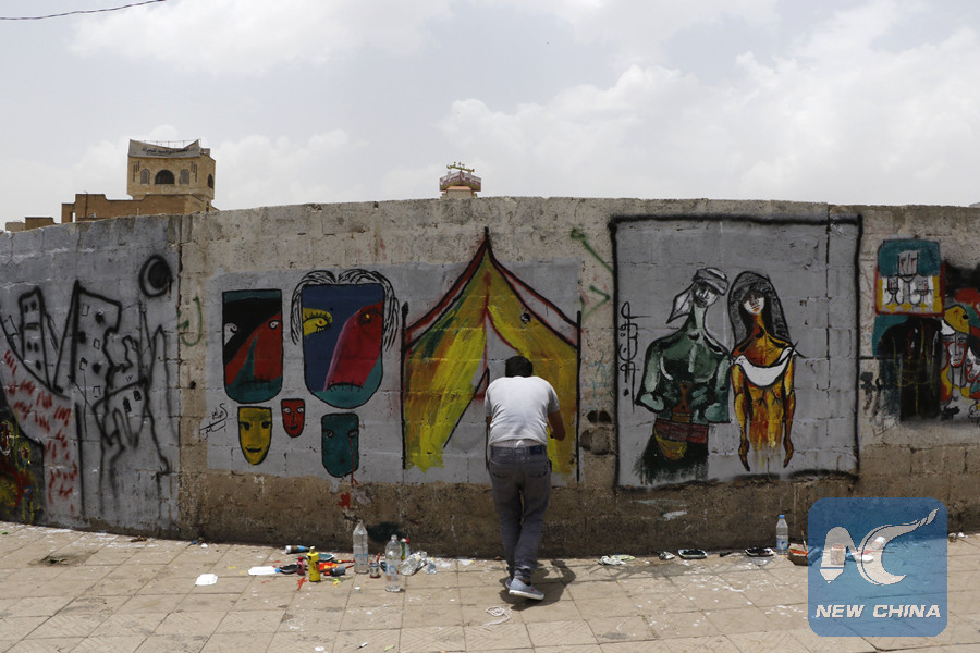 "Violence against the Yemeni women and children has been increasing in the war," Mubarak told Xinhua. "I'm drawing graffiti today to depict the social, economic and mental pains of women and children at war."
