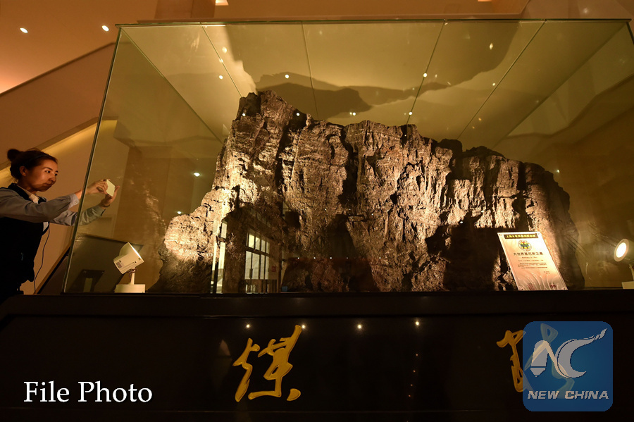 A tourist takes photos of a huge piece of coal displayed at the Datong Coal Museum, which is located underground at the Jinhuagong National Mine Park in Datong City, north China's Shanxi Province, May 16, 2017. (Xinhua/Cao Yang)