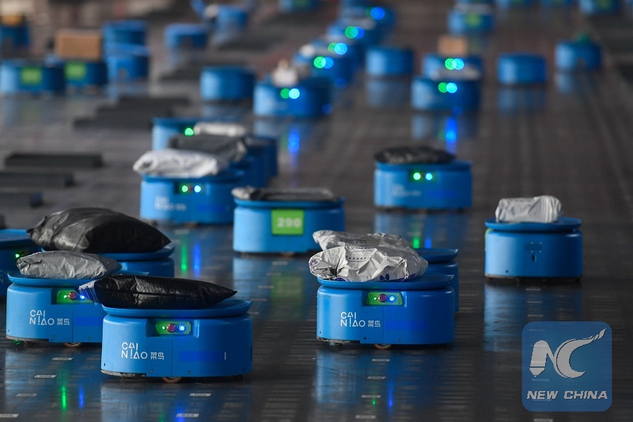Robots operated by Alibaba's logistics unit Cainiao move parcels at a new aunomated guided vehicles (AGV) warehouse inside the hub of delivery company YTO Express, in Hangzhou, Zhejiang province, China, on September 14, 2018.