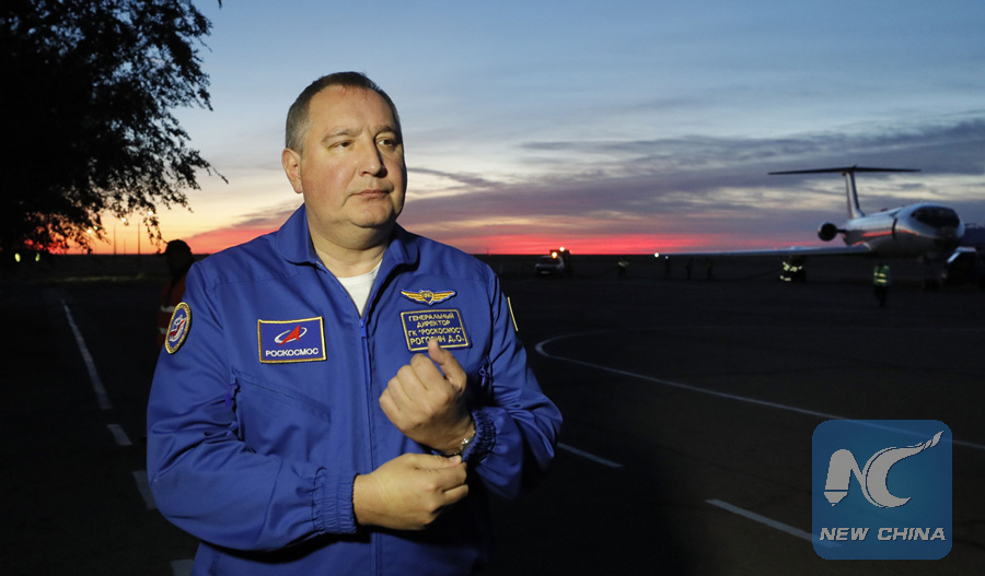 In this file photo taken on October 11, 2018 Dmitry Rogozin, the head of the Russian space agency Roscosmos, speaks with the media upon arrival with NASA astronaut Nick Hague and Russian cosmonaut Alexey Ovchinin (both not pictured) in Baikonur, Kazakhstan.