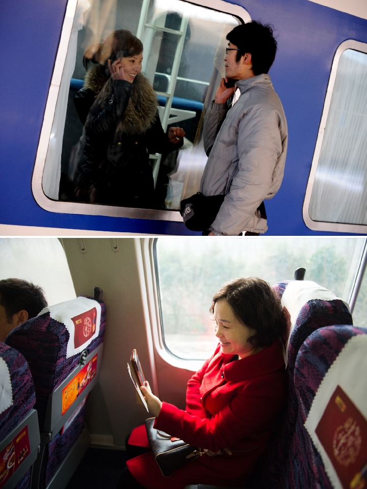 This combo photo shows a couple making a farewell phone call across a train window at the Zhengzhou Railway Station in Zhengzhou, central China's Henan Province, Jan. 23, 2009 (top, photo taken by Zhu Xiang); and a passenger having a video chat with a friend using 4G network aboard a bullet train which travels from Hefei, east China's Anhui Province to Jiangshan, east China's Zhejiang Province, Feb. 4, 2015 (bottom, photo taken by Du Yu).