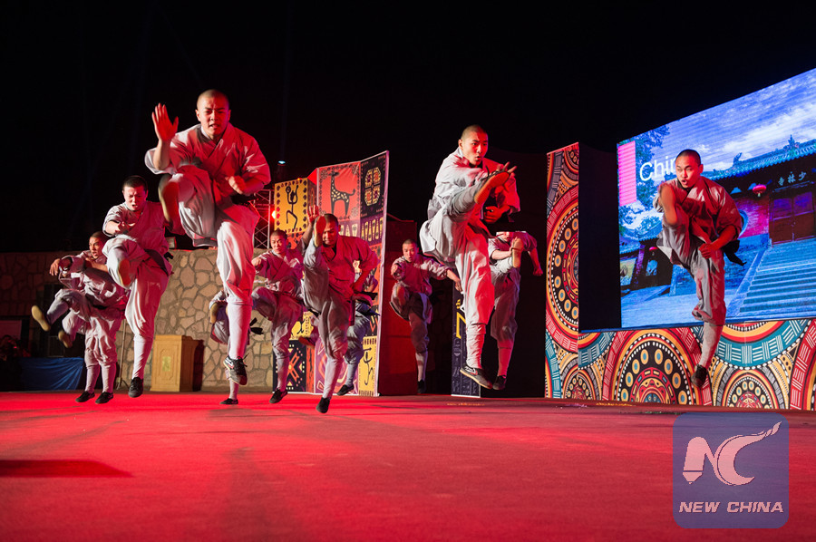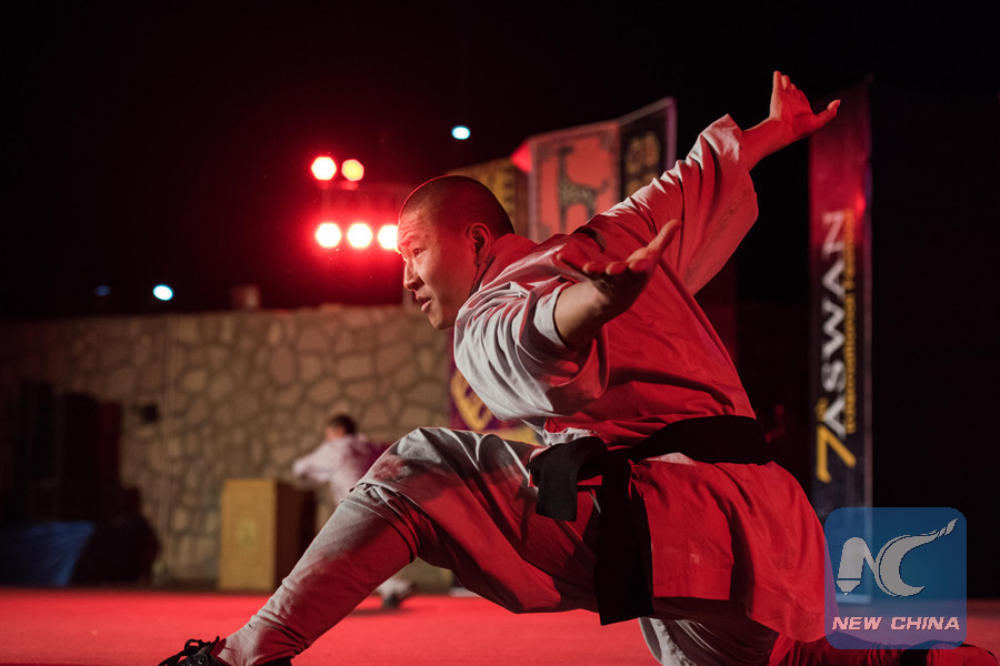 Monks of the Chinese Shaolin Kung Fu group perform at the opening ceremony of Aswan International Festival of Culture and Arts in Aswan, Egypt, Feb. 17, 2019. (Xinhua/Meng Tao)