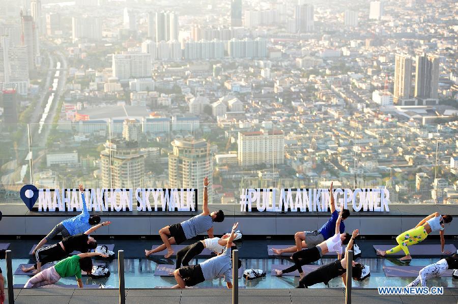 People practice yoga at an observation deck on the rooftop of a skyscraper in Bangkok, capital of Thailand, Feb. 19, 2019. China will hold the Conference on Dialogue of Asian Civilizations starting from May 15. Under the theme of "exchanges and mutual learning among Asian civilizations and a community with a shared future," the conference includes an opening ceremony and sub-forums. (Xinhua/Rachen Sageamsak)