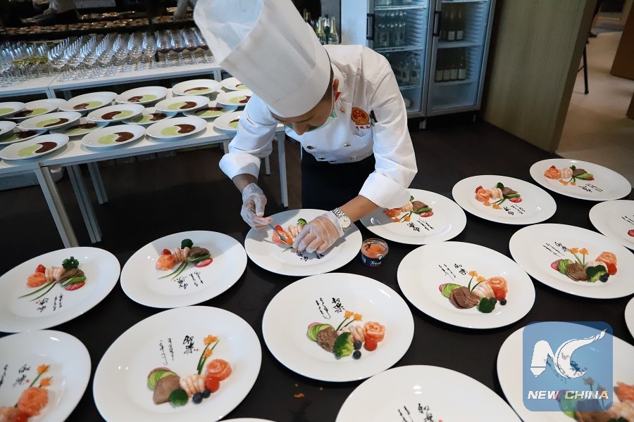 A Chinese chef prepares cold dishes of Sichuan Cuisine at "Confucius Institute Banquet -- A Taste of Sichuan" in Dublin, Ireland, May 15, 2019. (Xinhua/Liu Xiaoming)