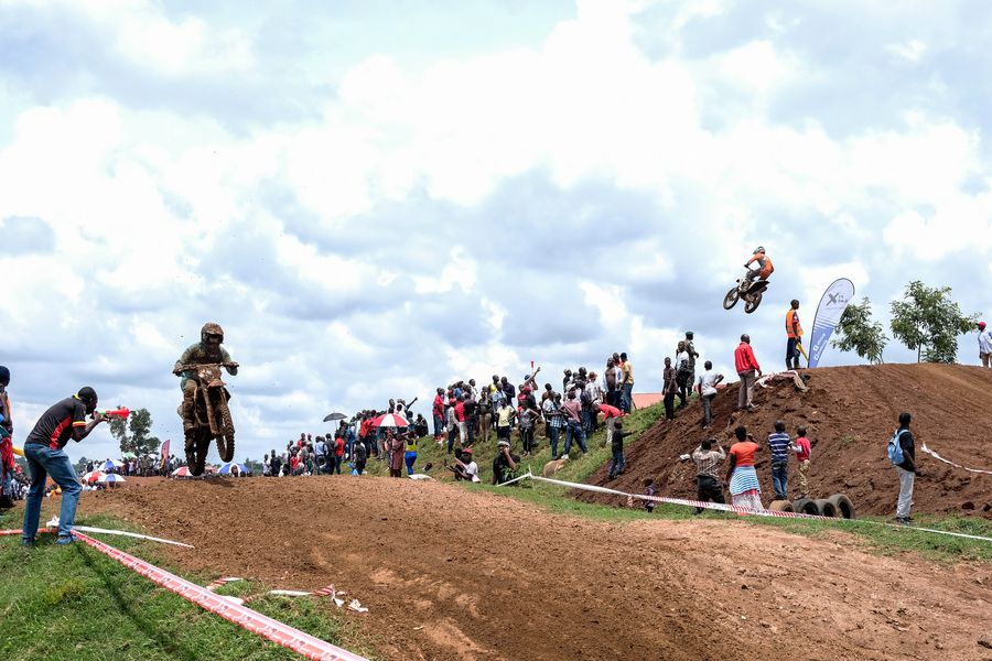 Thomas Vongsana hits the sky during the MX1 race as the crowd cheers him during the Armed Forces Appreciation Motocross Championship competition at Busiika Motocross Arena in Luwero district, central Uganda, Oct. 6, 2019. (Xinhua/Hajarah Nalwadda)