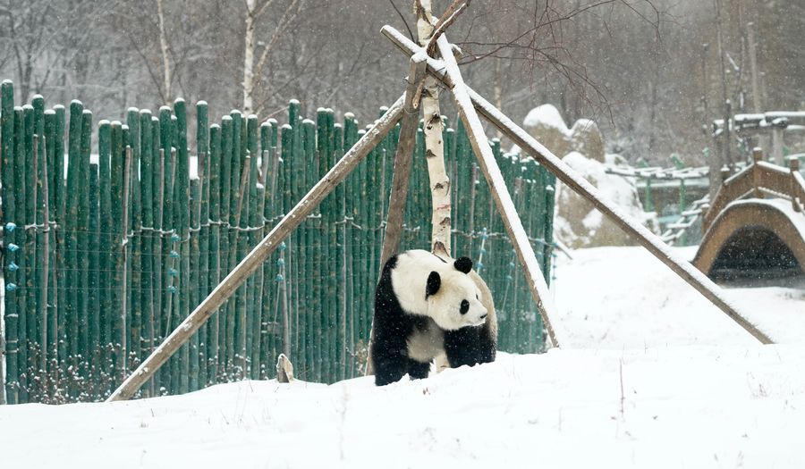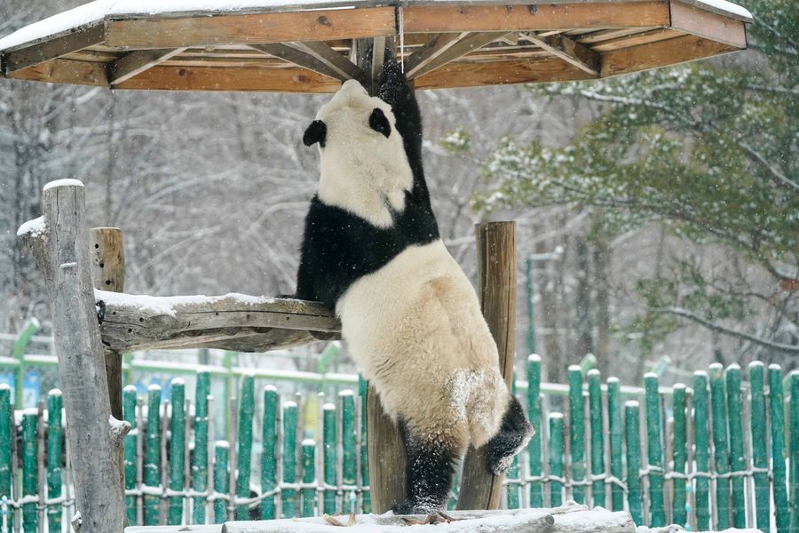 Giant panda Sijia plays in a snow-covered pavilion outside the panda house in the ski resort of Yabuli in Shangzhi County, northeast China's Heilongjiang Province, Nov. 13, 2019.(Xinhua/Wang Song)