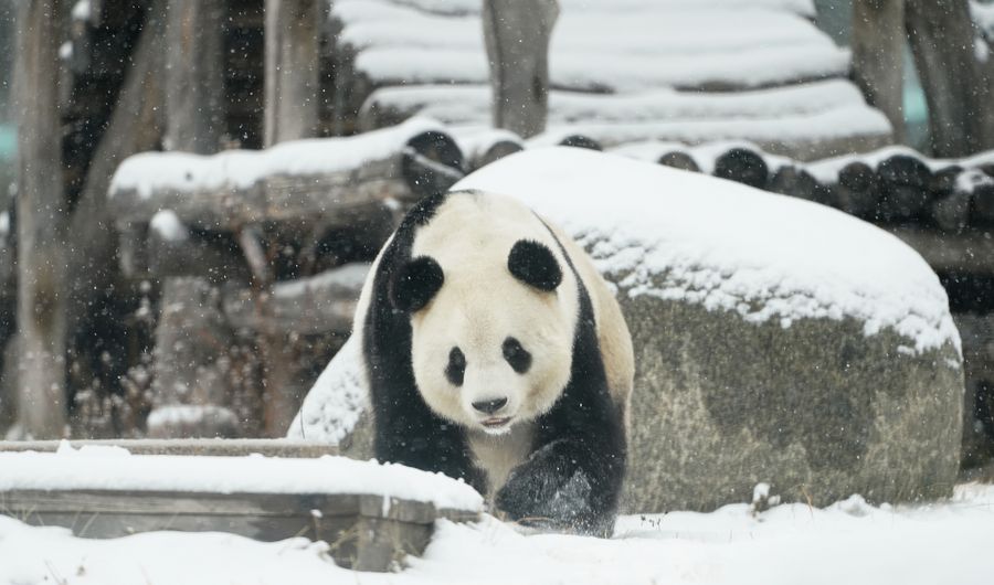 Giant panda enjoys snowfall in north China