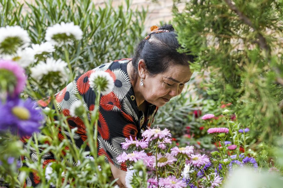 A villager checks flowers at home in Kashgar, northwest China's Xinjiang Uygur Autonomous Region, Aug. 18, 2019. Many local villagers in Xinjiang have lifted themselves out of poverty through plantation and livestock breeding. (Xinhua/Wang Fei)
