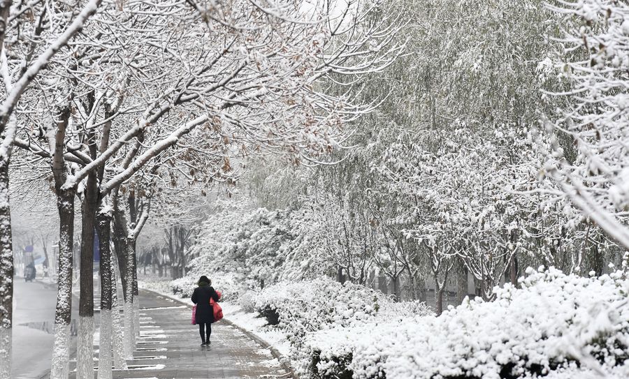 A woman walks under snow-covered trees in Beijing, capital of China, Nov. 30, 2019. (Xinhua/Li Xin)