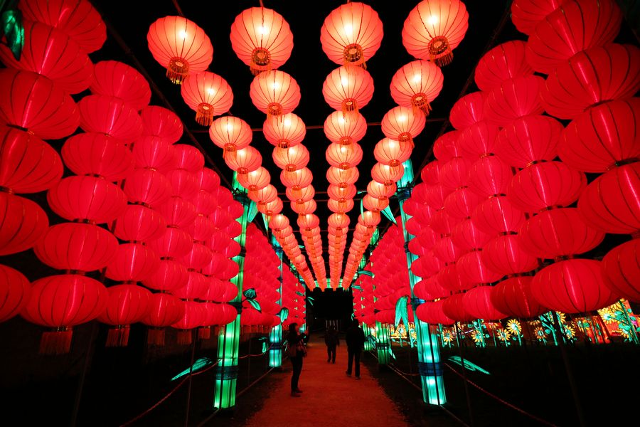 A visitor takes photos of a light installation from Zigong, a city in southwest China's Sichuan Province, during the Chinese Lantern Festival at the Castle of Selles sur Cher, 228 kilometers south of Paris, France, Dec. 15, 2019. (Xinhua/Gao Jing)
