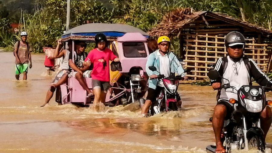 Residents wade through flood brought by Typhoon Phanfone in this photo from Dec. 25, 2019 in Leyte Province, the Philippines. (Xinhua/Stringer)