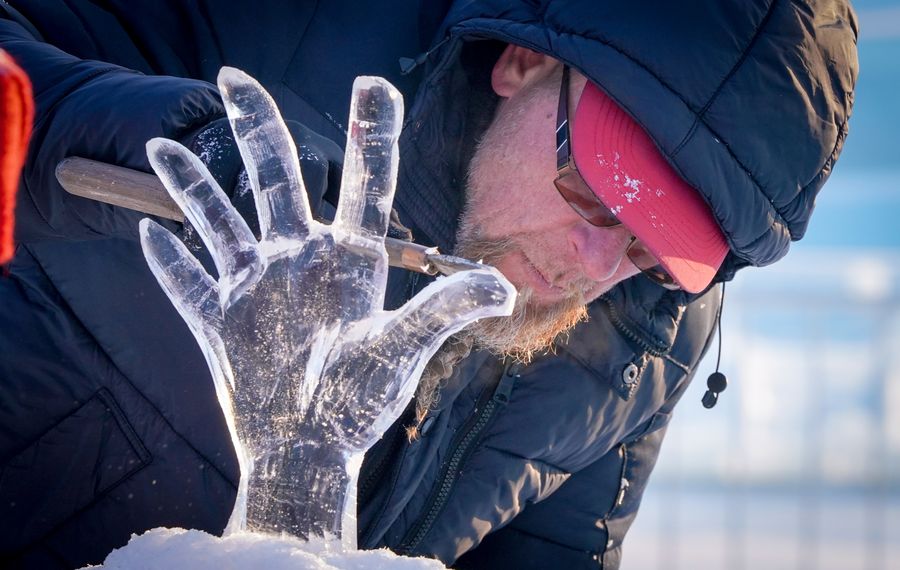 A sculptor takes part in the 9th China Harbin International Ice-Assemblage Championship in Harbin, northeast China's Heilongjiang Province, Jan. 3, 2020. (Xinhua/Wang Song)