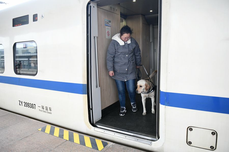 A guide dog and its trainer get on a train at Baoji South Railway Station in Baoji, northwest China's Shaanxi Province, Jan. 12, 2020. Guide dogs are trained to adapt to taking bullet trains in order to help visually impaired passengers navigate during the Spring Festival travel rush. (Xinhua/Li Yibo)
