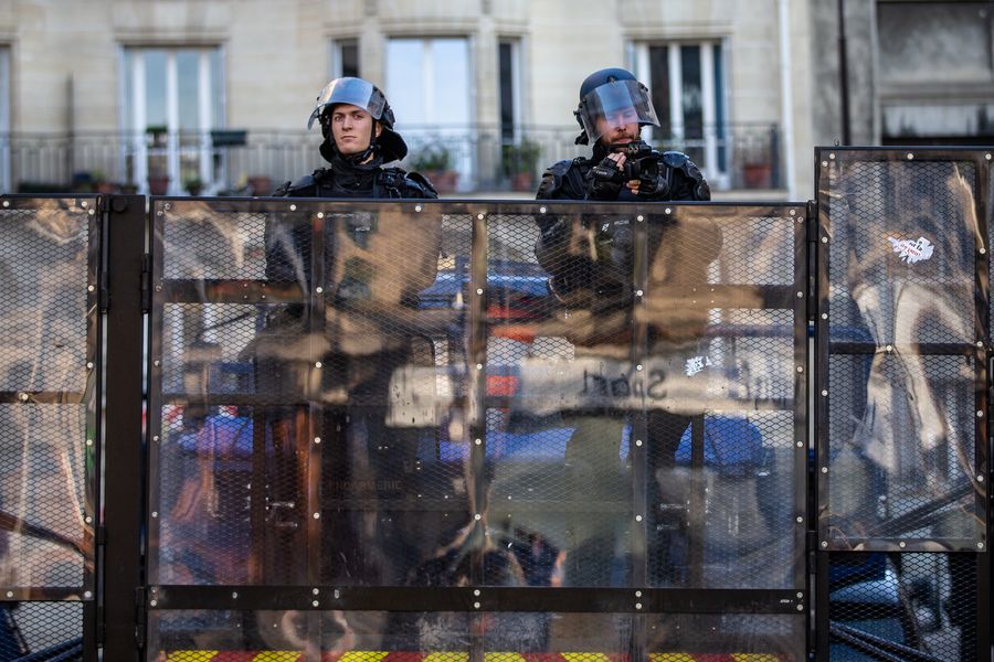 Policemen guard during the demonstration in Paris, France, Jan. 16, 2019. (Photo by Aurelien Morissard/Xinhua)
